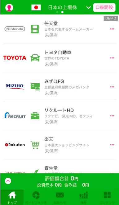 任天堂、トヨタ自動車、楽天など、日本を代表する企業30社を取り扱っており、それらの銘柄を1000円から購入することが可能です。