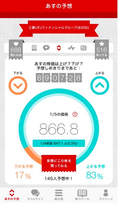 1日に1つずつ、株の銘柄が問題として出題されるので、その銘柄の株価が、上がるのか下がるのかを予想していきましょう。
