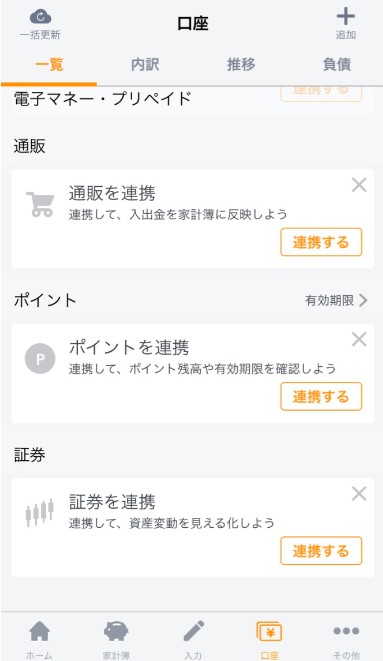 こちらのアプリでは、銀行口座やクレジットカード、電子マネーなどの情報をアプリに登録することによって、入出金を自動で取得し記録してくれます。