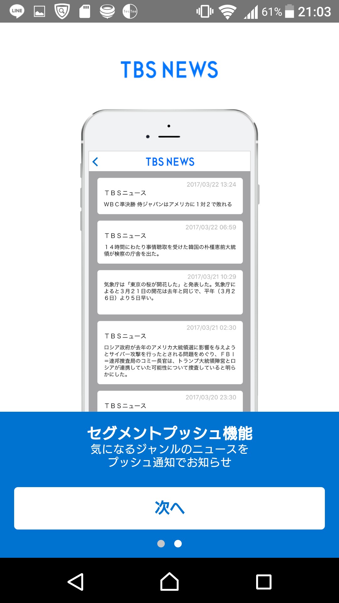 「TBSニュース」には、プッシュ通知で速報を知らせてくれる機能があります。