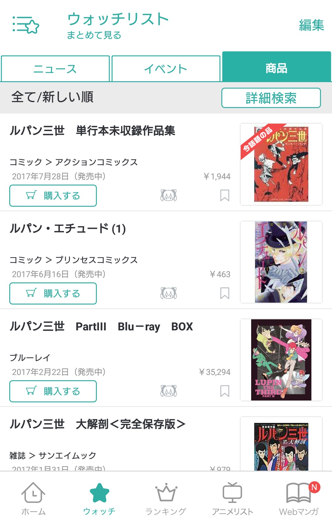 アプリ内の「ウォッチ」機能を使って気になるキーワードを事前に登録しておくと、そのキーワードに関連する最新ニュースや商品、各種イベント情報などをチェックする事ができます。