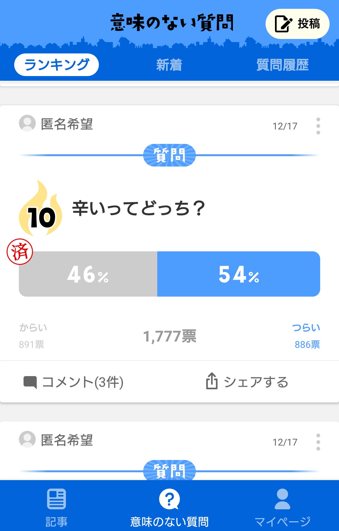 特に意味がないけど気になる事柄について、ユーザーが匿名で質問を投げかけ、それに対して他のユーザーが2択から投票するというものです。