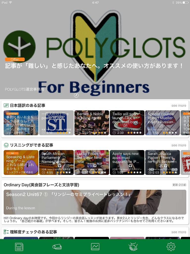 80万人が利用している英語リーディングアプリです。記事の途中で分からない単語が出てきたらタップすることで辞書が開く「ワンタップ辞書」が人気のポイントです。キュレーション型のアプリなのでジャンル数も18と様々な内容の記事を読むことができます。就職活動に有利なTOEIC資格の対策までできる点も魅力的です。一人で勉強するのは寂しいと思う方はアプリ内の「HandShake」機能を使って、一緒に学ぶお友達を見つけてみましょう。