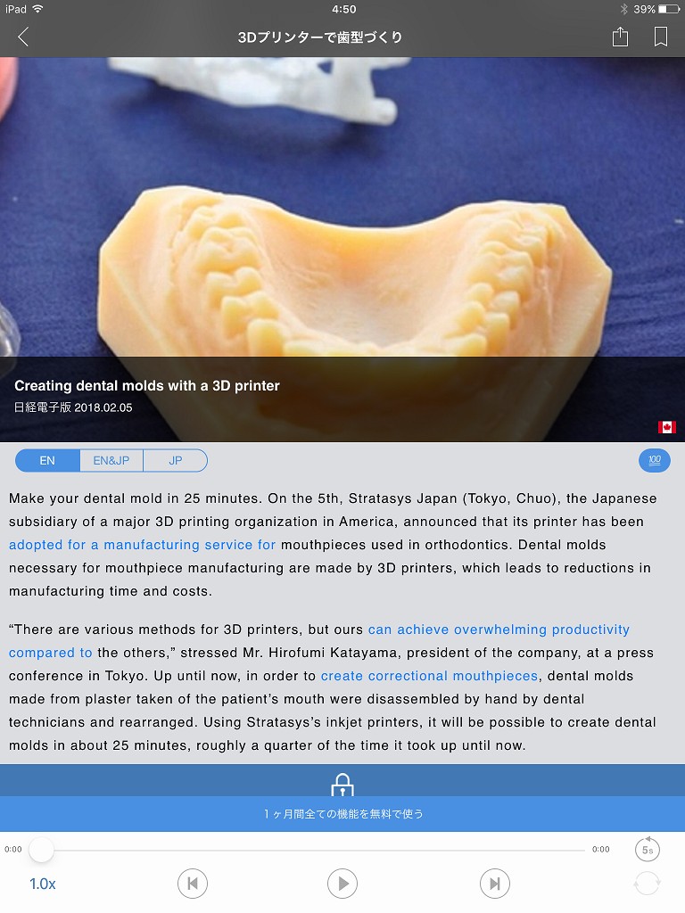 ニュースを英語で読み上げてくれる学習型アプリですが、このアプリが秀でている所はアメリカ英語とイギリス英語の両方を聴ける点です。二つは単語や文法が異なるので、会話する相手によってはニュアンスに差がでてきます。このアプリでしっかり勉強しておくと良いでしょう。ニュース内容は日本のものを取り上げているため馴染みやすいです。コンテンツは有料ですがお試し期間の1ヶ月は無料で全てのコンテンツを利用できます。
