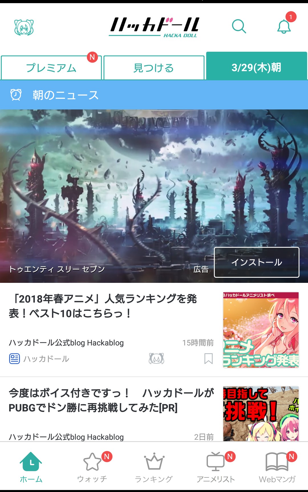 「ハッカドール」はアニメ関係専用のニュースアプリです。