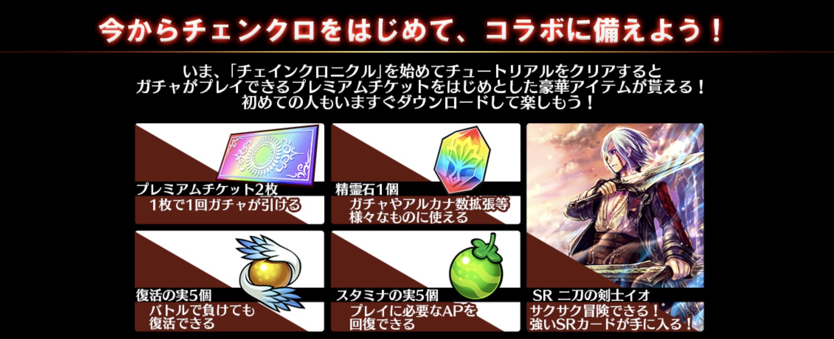 さらに、今から「チェインクロニクル」を始めてチュートリアルをクリアすると、SRキャラや、ガチャが引けるプレミアムチケットなど、豪華アイテムがもらえます。