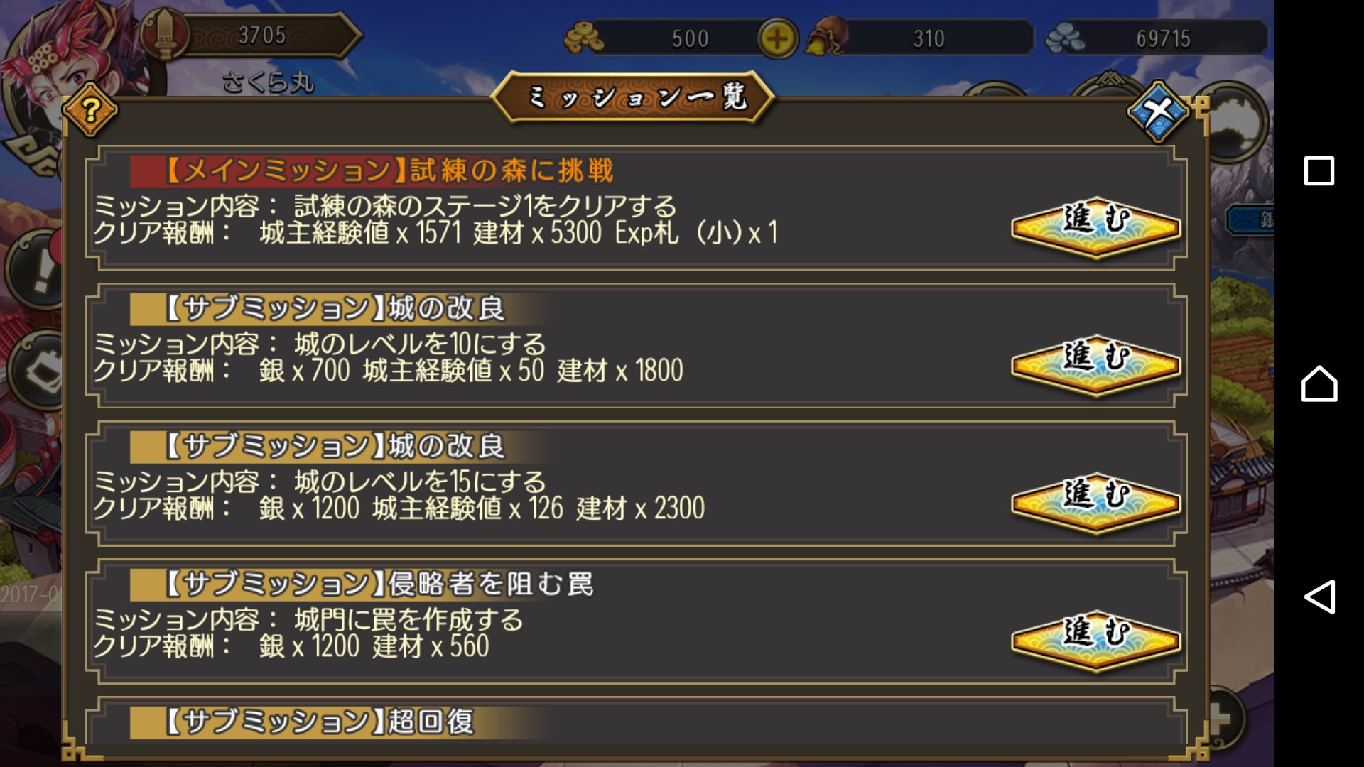 迷ったら「!」のアイコンをタップしてミッション一覧から「進む」をタップすればどんどん進んでいってくれるので、そんなに迷うことはありません。