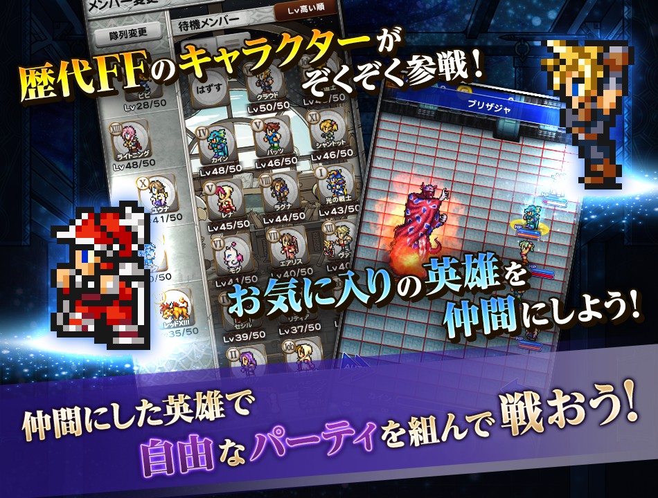 無料ゲームアプリ『ファイナルファンタジー・レコードキーパー』の戦闘時はFFシリーズではお馴染みのアクティブタイムバトルを採用。ゲージがたまればアビリティや必殺技の発動も可能!闘う敵は歴代FFシリーズの強敵たち。バトルで好成績を残せばスコアボーナスで取得できる経験値やギルがアップ!たくさんの経験値とギルを集めてパーティを強化します。使用できるキャラは初代から13作目までの歴代メインキャラ。ものが質が進むとたくさんのキャラが仲間になってくれます。クエストクリアやログインボーナスなどで入手できる「英雄の魂」を使うことでも仲間にすることができます。さらにレベル上限までアップさせたキャラは「記憶結晶の原石」でさらなるレベルアップも可能!100を超えるキャラのなかからお気に入りのキャラをメンバーに加えることができます。これまでのFFキャラを混ぜたドリームチームを作ることだって可能です。