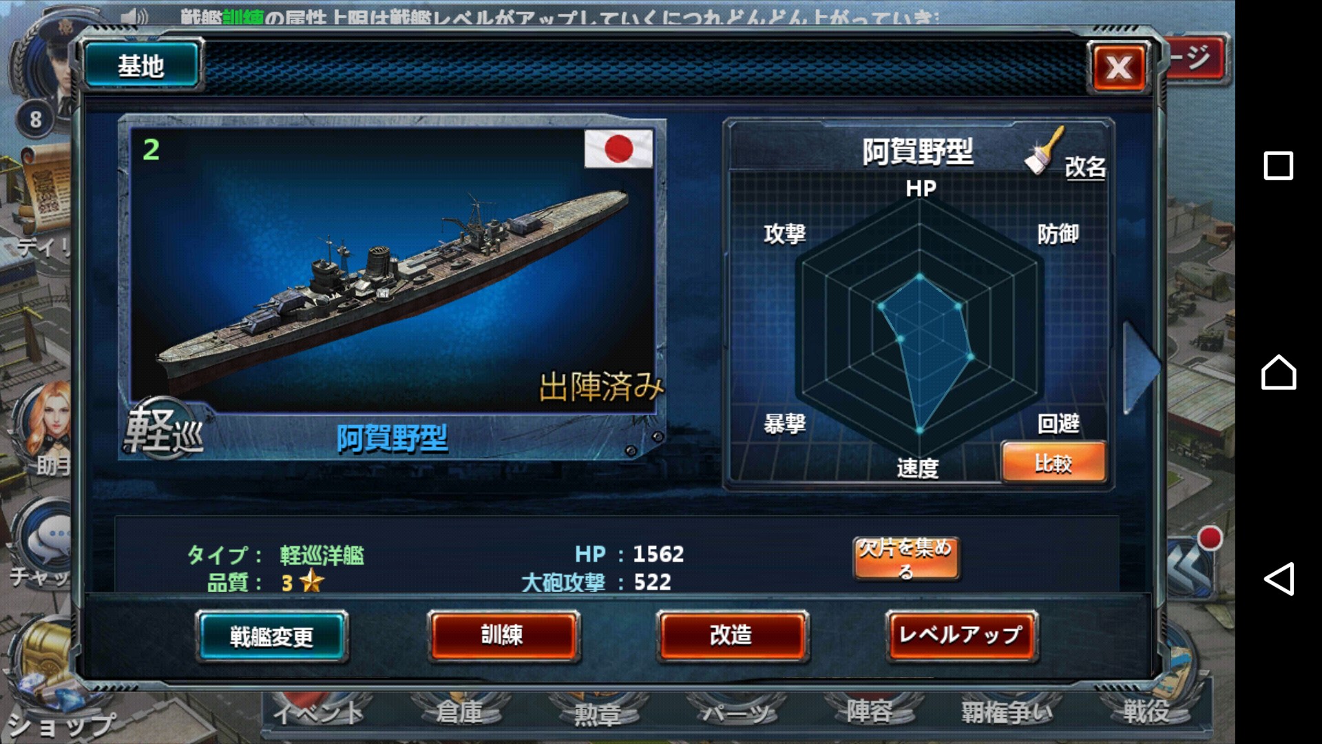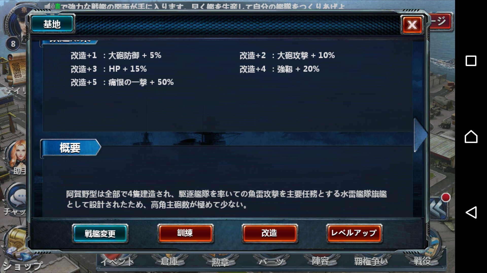 製造した戦艦を戦闘、訓練、を通じ改造しレベルアップさせましょう!
