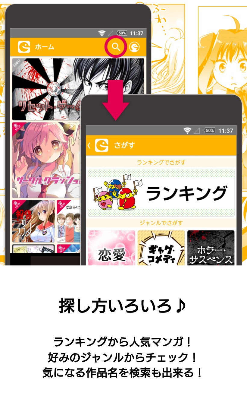 アプリをダウンロードした直後は、多数の作品の中から何を読むか迷うこともあるでしょう。そんな時は、アプリ内のランキングから作品を探すことができます。