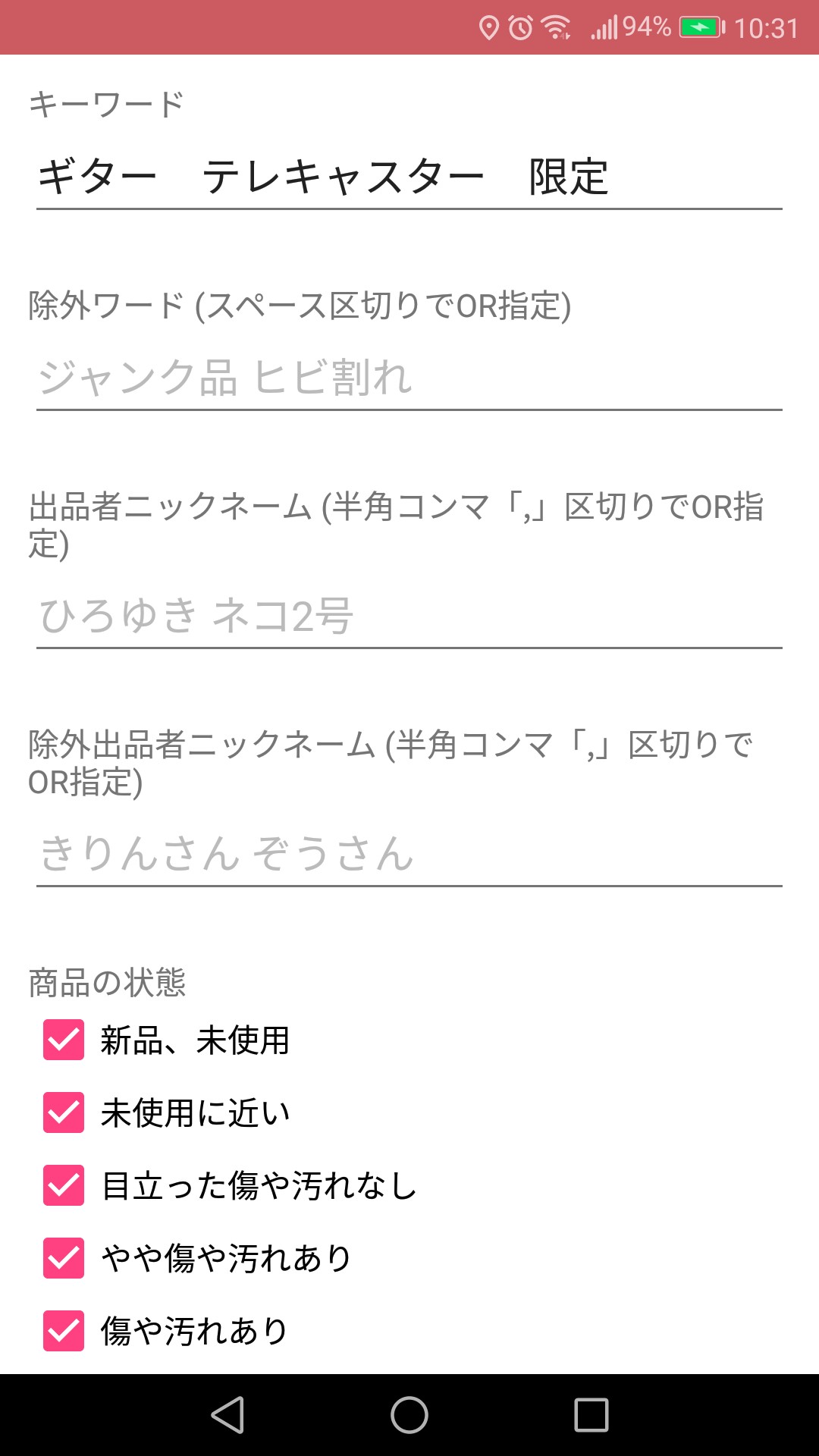商品を探すキーワード、除外ワード、出品者、除外出品者、商品の状態、送料、対象フリマサービス、価格を指定して、条件を保存するだけ該当商品を探せるようになります。