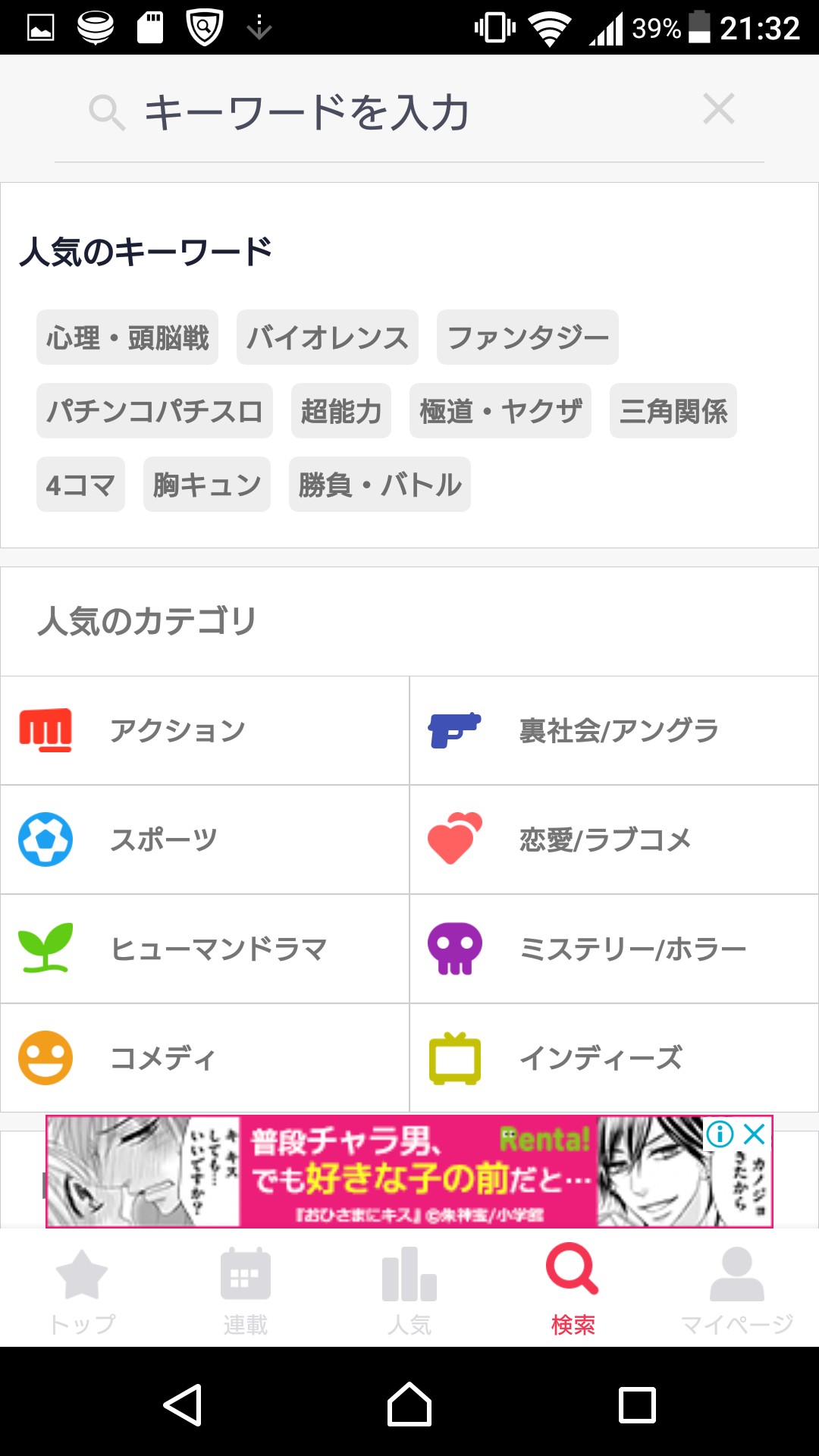「4コマ」「王道バトル」などのキーワードを入力しても検索できるので、試してみてください。