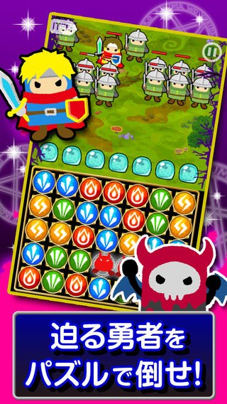 倒せ勇者!の主役は勇者ではなく魔王の使い魔。指名だから仕方ないとはいえ、毎度毎度侵攻してくる勇者を追い返す苦労が偲ばれるパズルRPGのゲームアプリです。