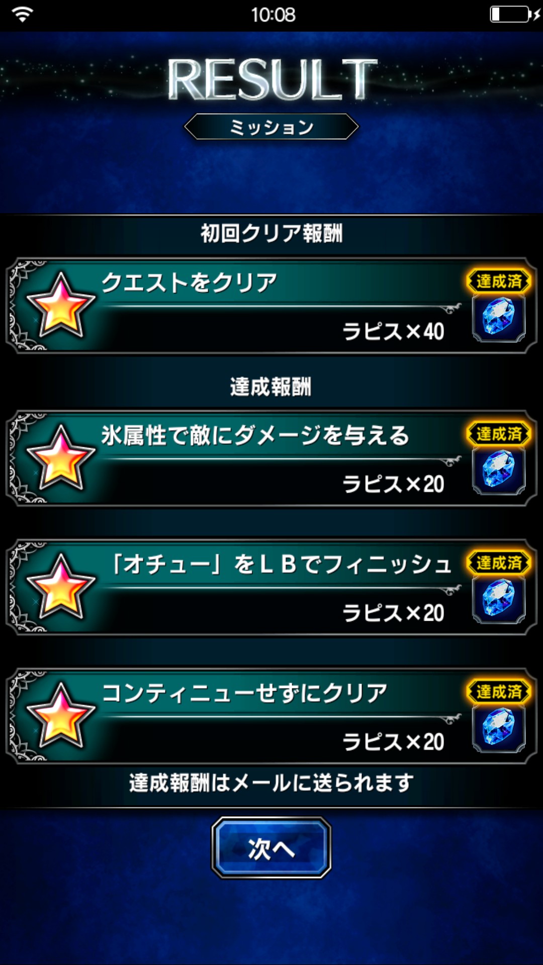 そしてリザルト、更にまたまたミッションでこんなにもらえるのでガチャに必要なラピスが1回で500、11連ガチャなら5000なんてすぐですね。