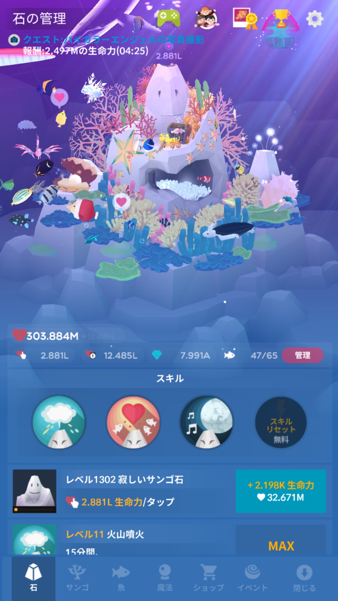 2、サンゴ礁を創ってレベルを上げて、生命力をたくさん集めていきます。