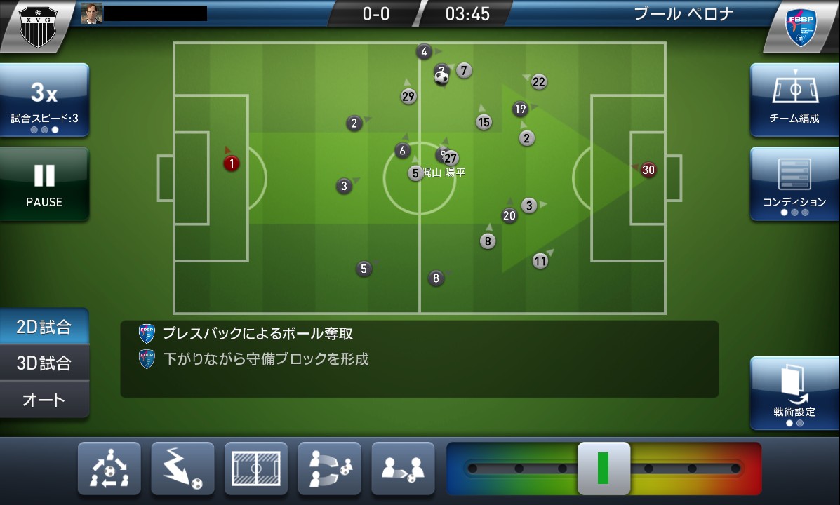 試合画面は3D表示と俯瞰による2D表示が選べます。3D表示は臨調感あふれるグラフィックで楽しめます。2Dは全体の様子が見渡せるので、戦略を練るのに便利ですね。試合の時間は、3D表示の場合かなり時間がかかる印象ですが、2D表示では3倍速に出来るので空いた時間にさくっと試合を進めることも可能。