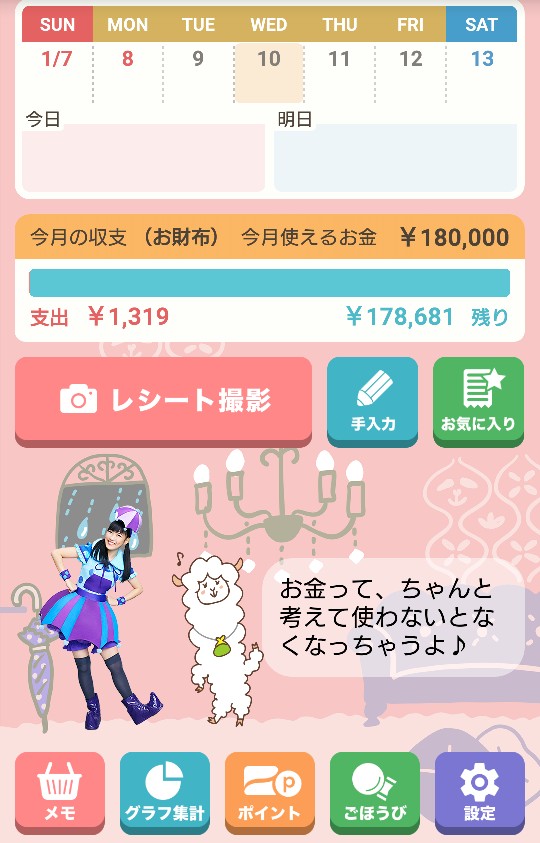 現在の家計残高や収入を入力したら、あとは毎日の買い物レシートを撮影するだけの短時間操作で入力は完了。買い物内容と金額は全て記録されているので、タップで仕分けだけ行えば一目で分かるグラフが出来上がっていきます。