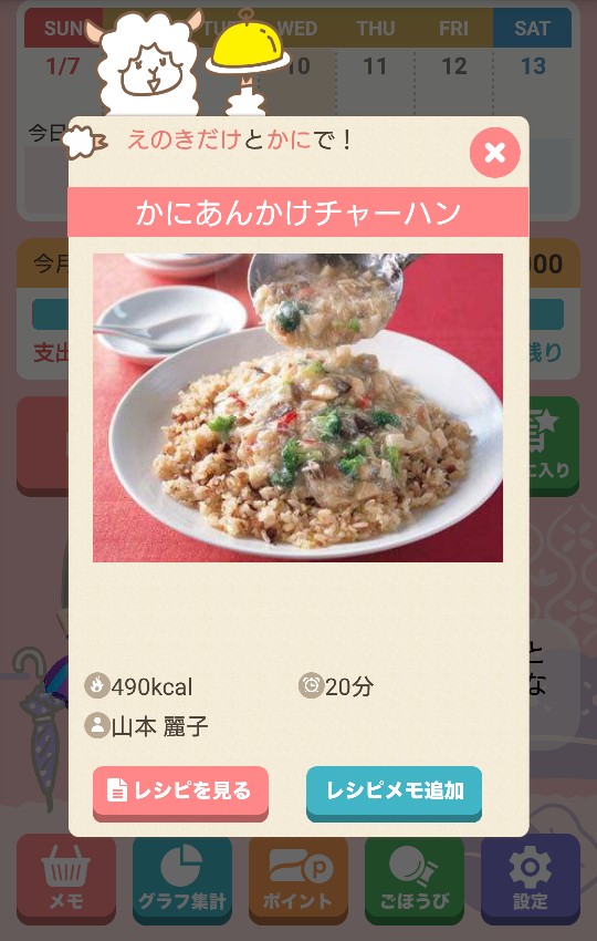 冷蔵庫の残り物を記録しておくと、少しの買い足しで作れる料理レシピを提案してくれるのが「レシーピ!あるかうメモ」の魅力です。