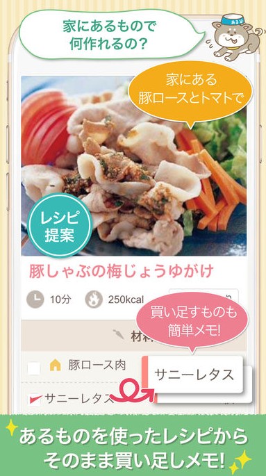 「レシーピ!」と同様にレシピの提案サポートをしてくれるので、冷蔵庫の中にある食材メモからその日の献立を考えて、買い物時の参考にも役立てていけます。