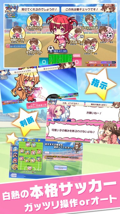 試合パートはマニュアルかセミオートを選べます。デフォルメたちが目まぐるしく動く試合展開は本格的で可愛らしくもあり目が離せません。要所要所でドリブルやパスなどの選択肢が出現するので、