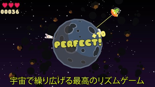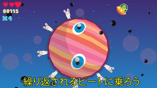 エンドレスに音楽続いていくことです。UFOにのった宇宙人が惑星を回って、動物たちを見つけていきます。ちょうどUFOの下に動物がきたらタップを押しましょう。タイミングよく押せるとスコアが伸びて、