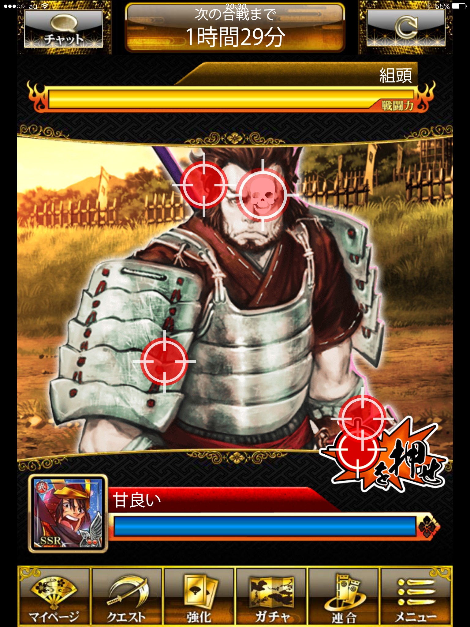 クエスト後は武将出現、ボス戦ですね。画面の丸をタップしてリズムよく押しましょう、時間制限があるのであまりゆっくりしてると攻撃を受けてしまいます。