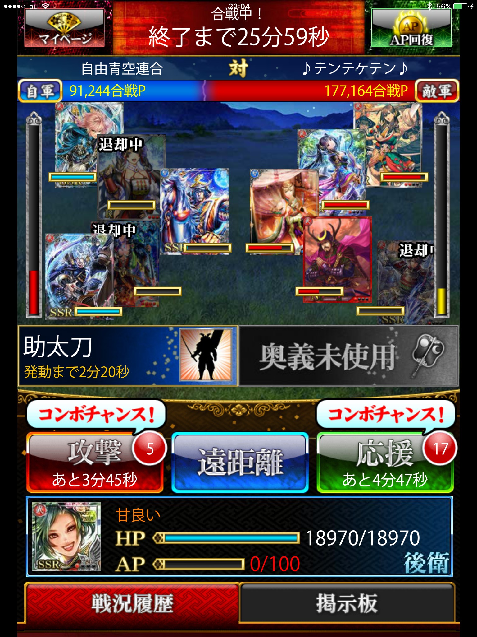 合戦は毎日12:00 19:00 22:00から開催され時間は30分で合戦時間中はいつでも参加できます。前衛、後衛に分かれて戦います。前衛は文字通り先頭に立って相手にダメージを与え、後衛は前衛のサポートの役割です。