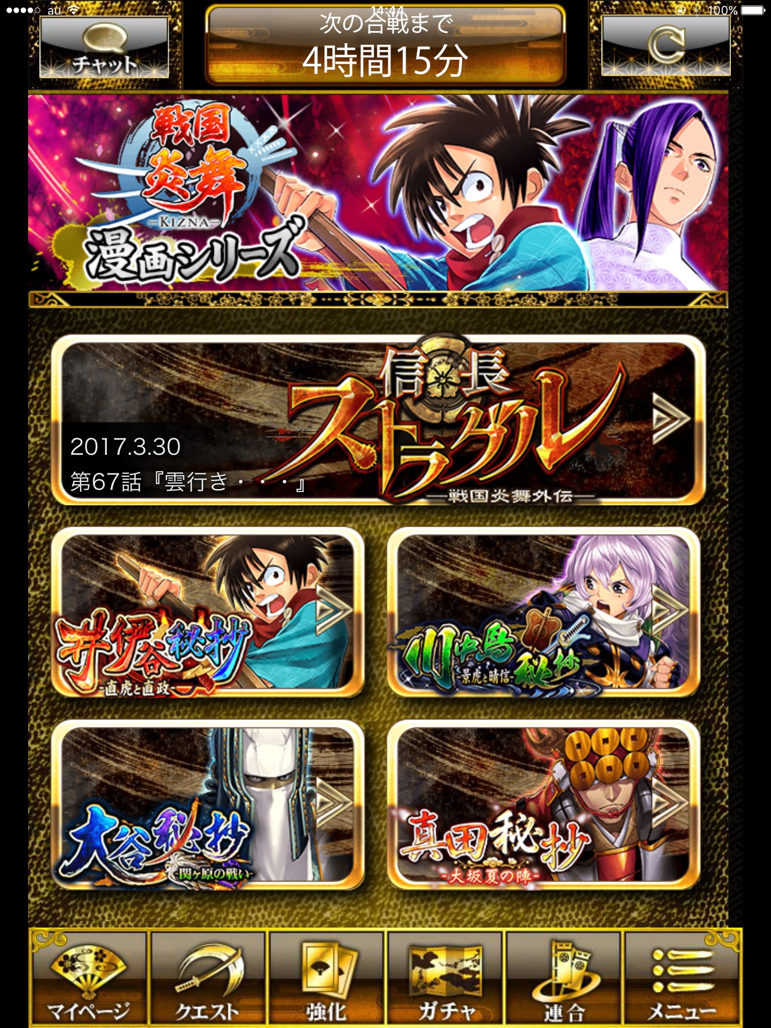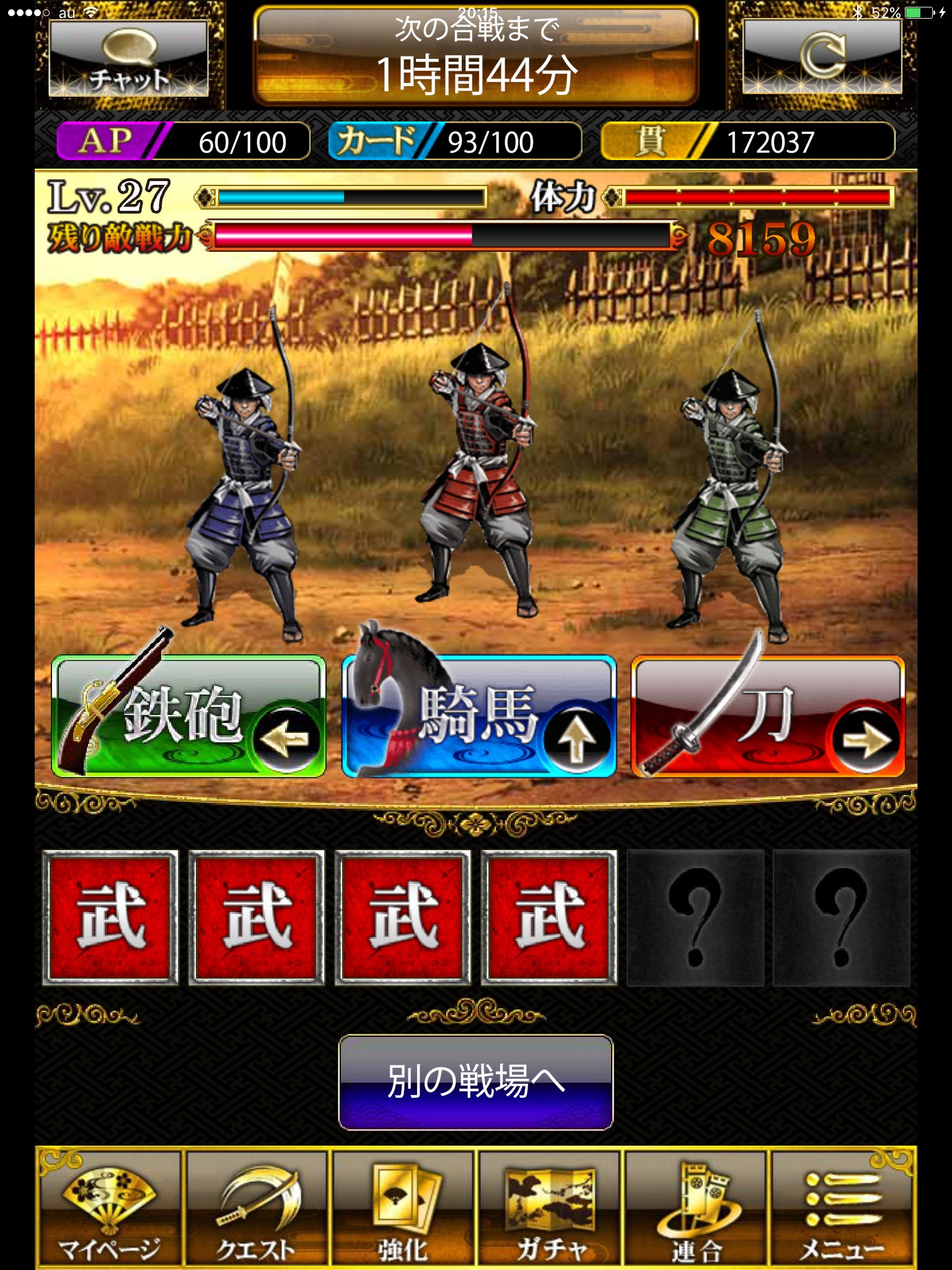 最初はカード系のゲームアプリの基本、クエストですよね。クエストのボタンは戦国時代らしく刀、鉄砲、騎馬の3つに分かれていて←↑→のフリックにも対応しています。
