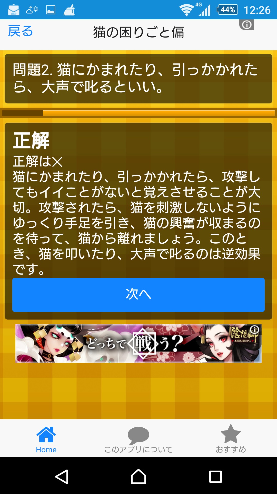 分かっているつもりでも、問題を間違えてしまったら正解をちゃんと丁寧な解説つきで教えてくれる、猫にとっても飼い主にとってもありがたいクイズアプリです。