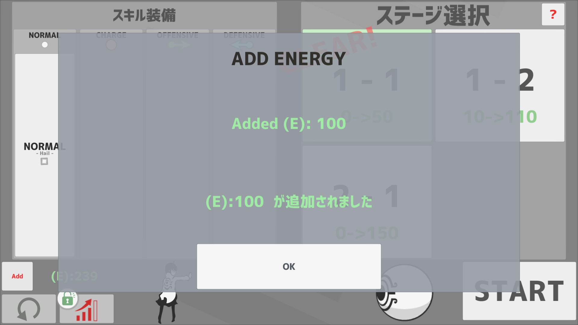スマホ画面の左下にある、ゲームメニューに表示されるaddボタンは100エネルギーを獲得することが出来ますので、せっかくですからタップして獲得しましょう。