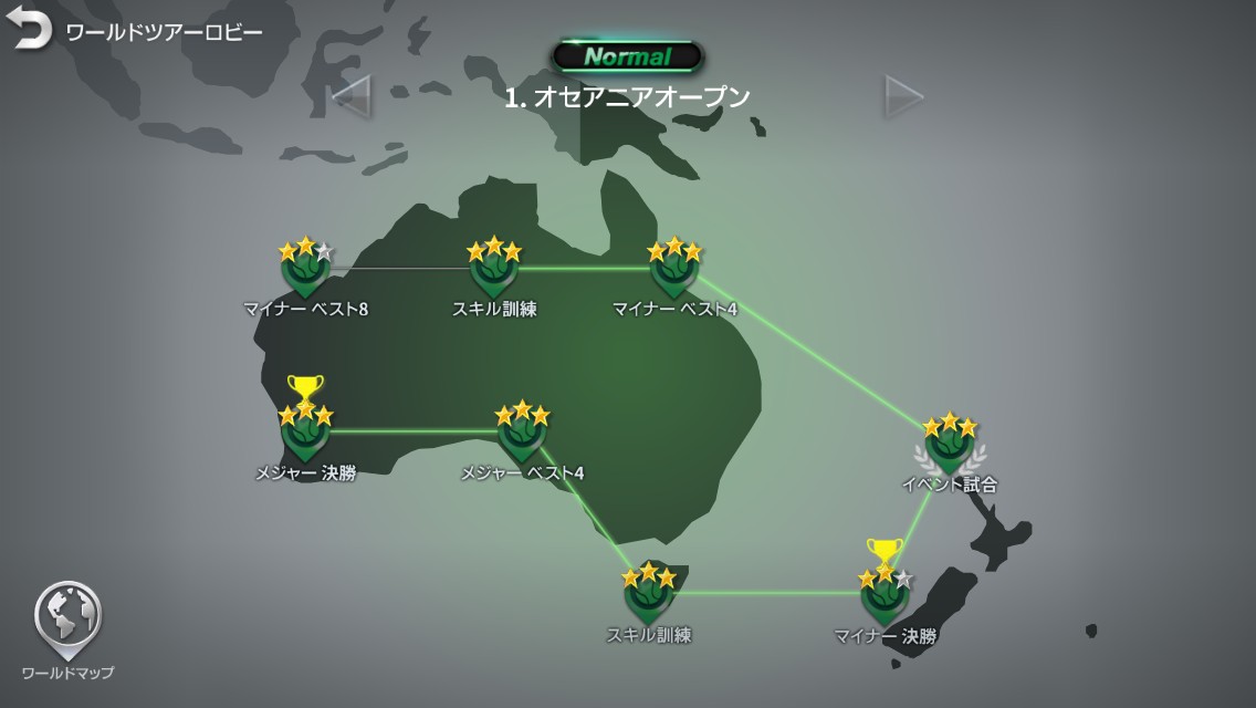 世界で戦う【ワールドツアー】、世界のアルティメットテニスをやっているユーザーと、リアルタイムで対戦する【リーグ】、友人対戦も可能で、友達と一緒にアルティメットテニスを楽しむことができる【アリーナ】、レベルが上がったら参加可能になる、各曜日ごとに開催されるイベント【マスターズ】と、様々なゲームモードが用意されています。