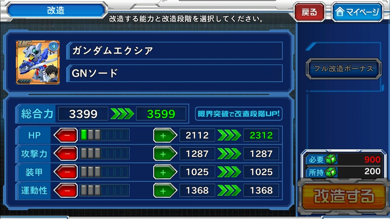 改造によって、HP、攻撃力、装甲、運動性といった基本パラメータを強化することができます。