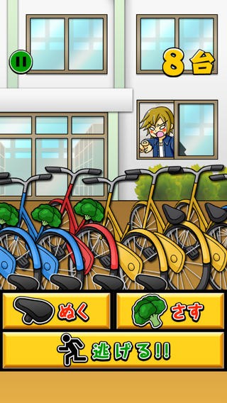 自転車アプリなのにまったく走らない!レースだけが自転車アプリではありません。シンプルだけど面白い、いたずら系の無料ゲームアプリ『自転車ブロッコリー』はくだらないのに思わずクスリと笑ってしまう単純ゲーム。舞台は校舎に面した自転車置き場。誰もいない自転車置き場でサドルを抜いてブロッコリーに変えるいたずら開始!「ぬく」「さす」をタップして一定数のサドルをブロッコリーにすり替えればゲームクリアとなります。校舎の窓に人影が見えたら一気に逃げる!誰かに見つかってしまえばそこでゲームオーバー。影が見えた瞬間に窓が開き、見つかってしまうので反射神経が鍛えられます。誰にも見つかることなく何本のサドルをブロッコリーに替えることができるのか。見つからないようにいたずらを楽しむ、ドキドキハラハラしながら新記録を目指します。走らないけどこれも自転車ゲーム。自転車を操作せずいたずらするというゲーム性はシンプルなのに黙々とプレイし続けてしまいます。