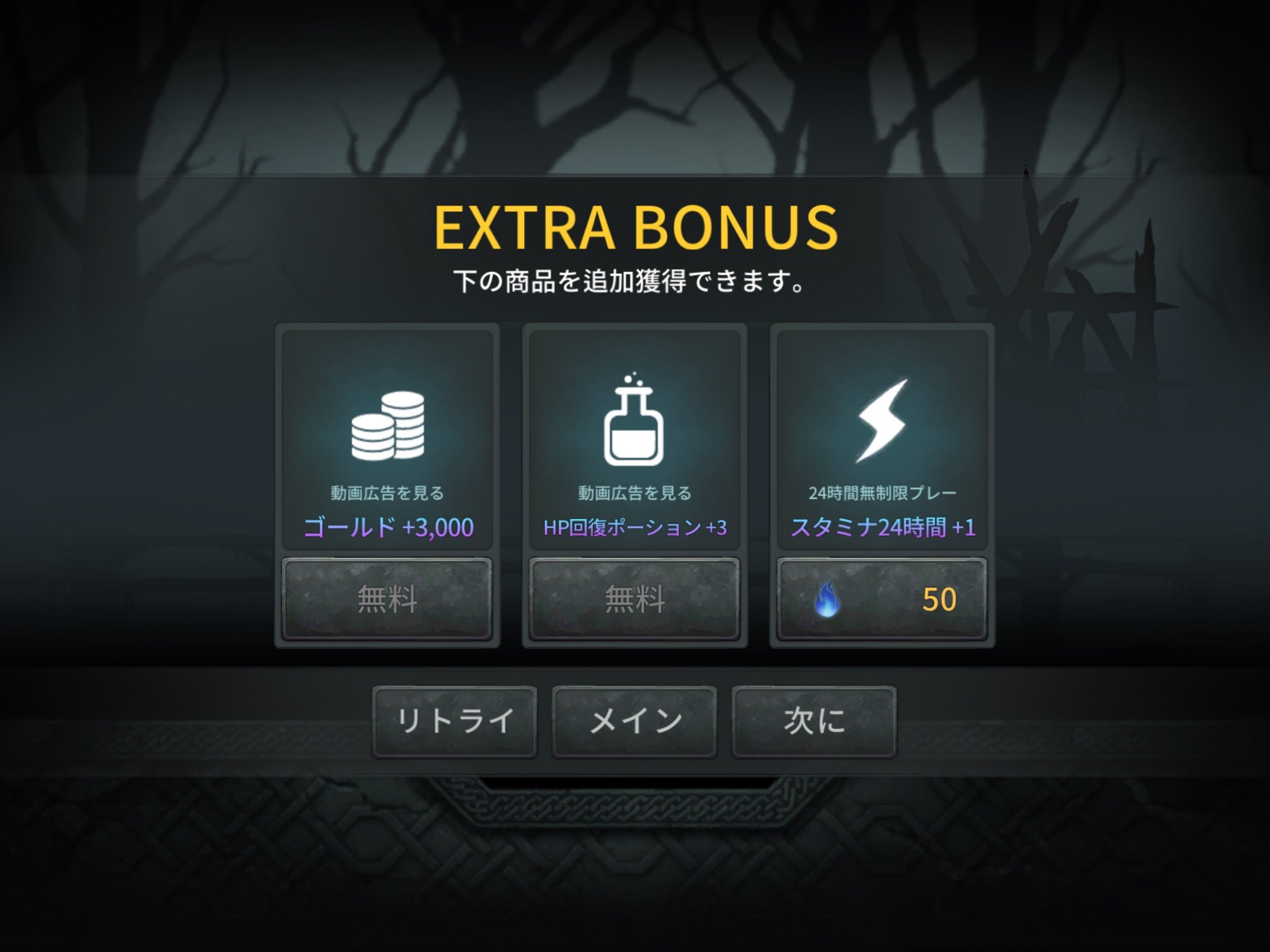 広告動画を見ただけで、コインや回復アイテムであるポーションが手に入るのです。30秒ぐらいのゲームアプリの広告動画を見ただけで、報酬が手に入るならちょっとお得感があります。