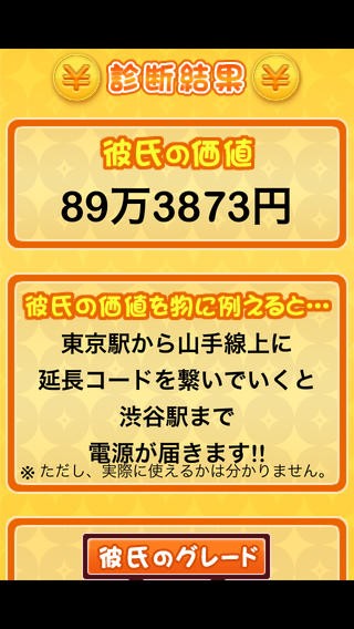 終了するといよいよ結果発表です。金額とともに物にまで例えてくれるおまけつき、彼氏の価値はあなたが思うより上でしたか?下でしたか?問題はランダムで出題されるため、何度でも繰り返し遊ぶことができます。