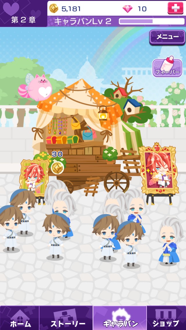 さらに、ストーリーを進める上で必要な『チャリン』やアイテムを集めることができる、【キャラバン】を育てて楽しむことができます。【キャラバン】はアプリゲームに欠かせないスタミナやチケット等の制度はなく、好きな時に好きなだけ遊べるので、どんどんストーリーを進めることができます。キャラバンに来たお客さんは、オマケシナリオを読むことができる『ネタカード』を落とすことがあります。