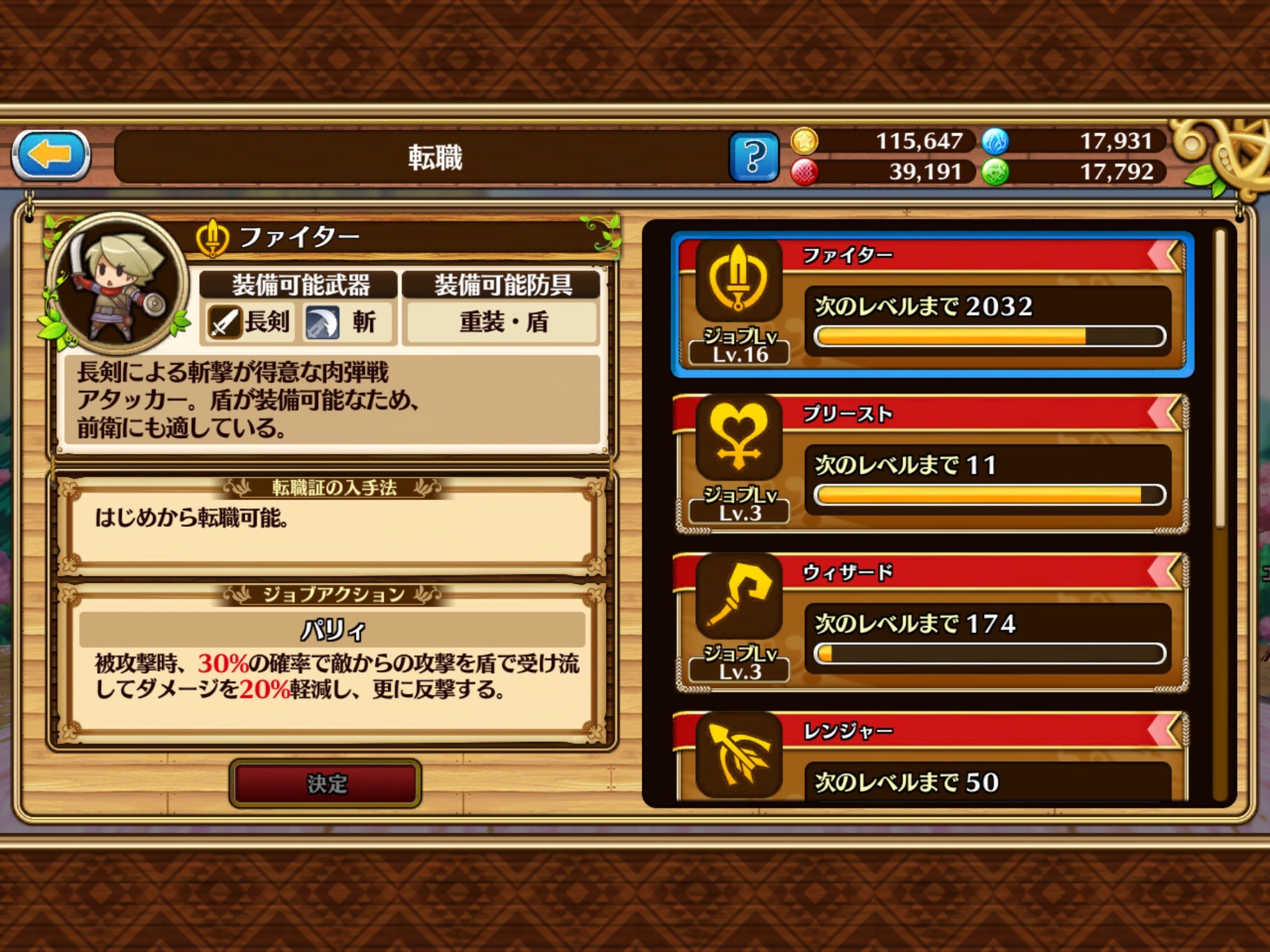 プレイ開始時で選択したジョブをそのまま強化していくのも良いですが、ジョブがいろいろありますので転職してみるのも良いでしょう。