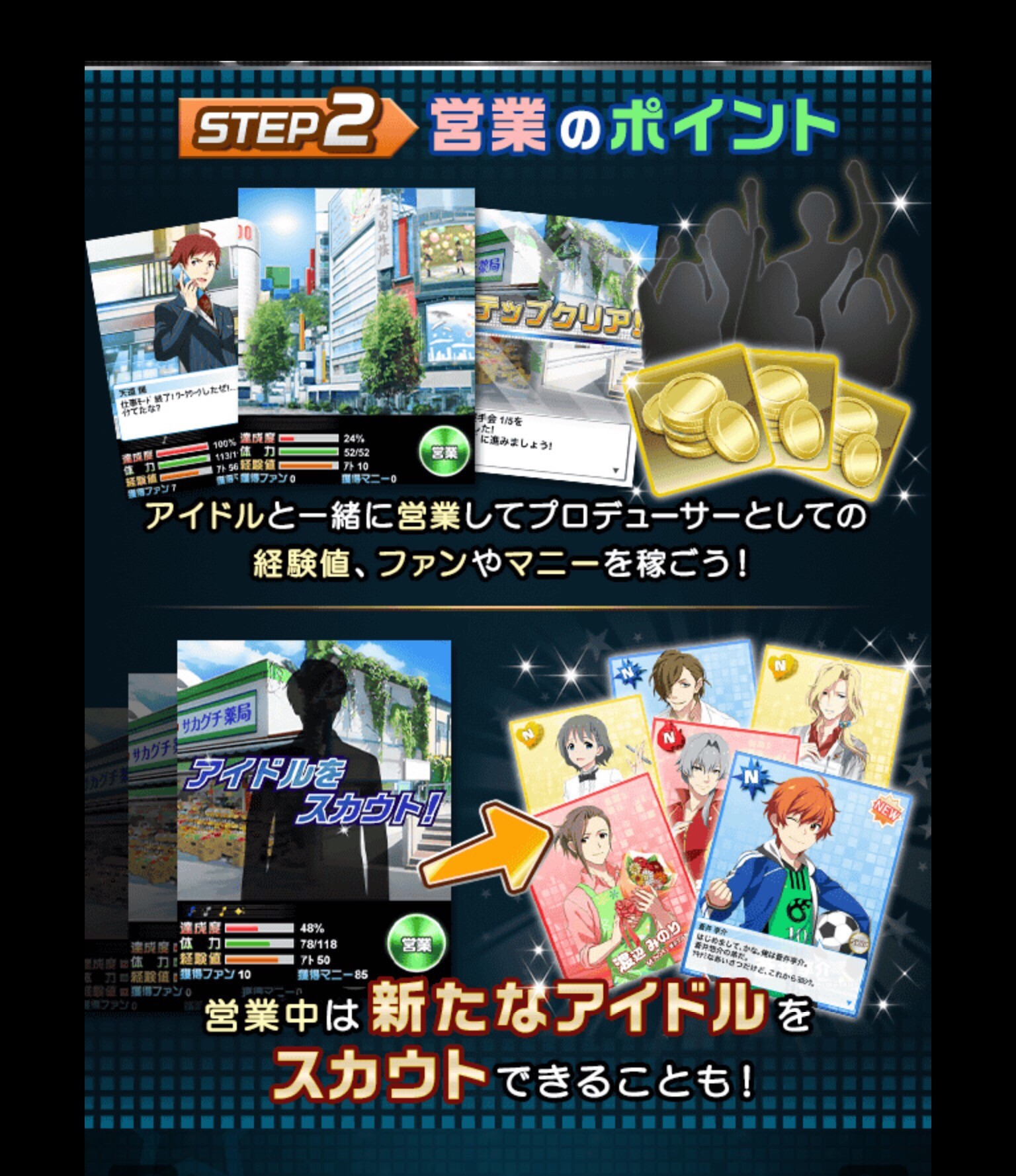 アイドルの育成はアイドルグループの小グループであるユニットで行います。営業、ライブ、オーディションバトルなどのアイドル活動があり、これをしていくことでアイドルのレベルが上がっていきます。