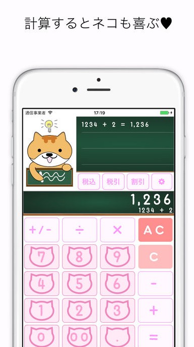 イラストネコの動きが可愛い「かわいいネコ電卓」は、計算機の基本的な機能に、税込み、割引計算が楽にできるのが魅力の女子向けアプリです。