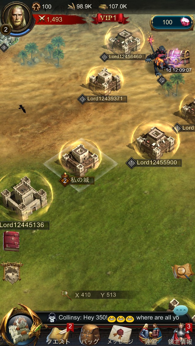 他のプレイヤーの城や、資源を採集出来る採石場や農村、徘徊するモンスターが目に入ってくるはずです。