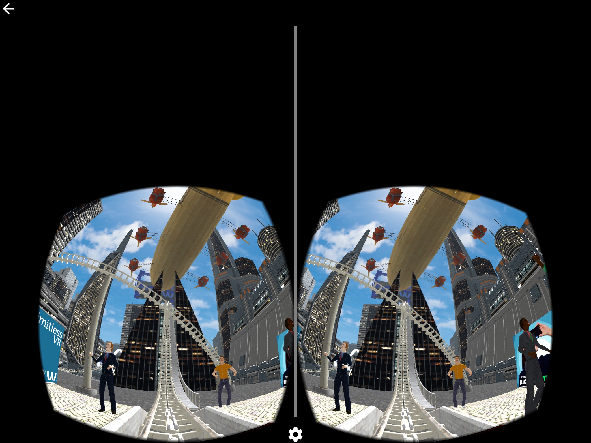 当たり前ではありますが、VRなので画面の真ん中から左右対称に同じ映像が並んでいます。これをVRゴーグルを使ってみると、立体的で臨場感のあるゲーム世界を楽しめると言うわけです。