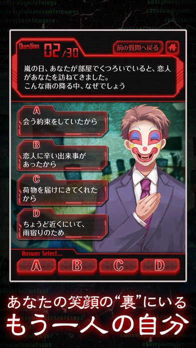 100%とか出てしまった日にはまさしくホラーですが、あくまで宴会の席で使うネタアプリとしてご認識ください。診断は簡単で選択肢の中から適切だと思われるものを選んでいくだけで、全部で30問あります。