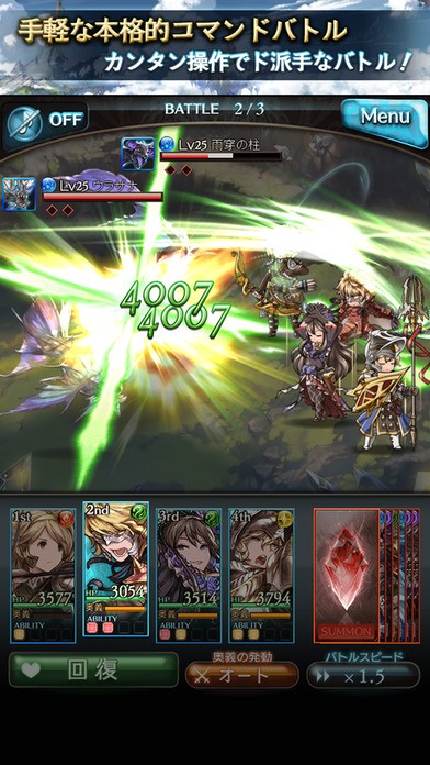 戦闘はコマンドを選択して敵を攻撃するポチポチタイプのゲームです。オート攻撃も搭載しているので格下相手の戦闘であればほぼ自動で片付きます。しかし強敵相手にはワンミスが命取りの超ハードなバトルに早変わり、