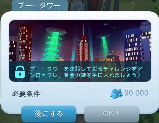ブー・タワーでは災害チャレンジができるようになります。災害チャレンジはランダムで建てたビルを壊されます。壊された建物は材料を使うことで立て直すことができ、壊れた建物をすべて直すことによって黄金のカギを手に入れることができます。