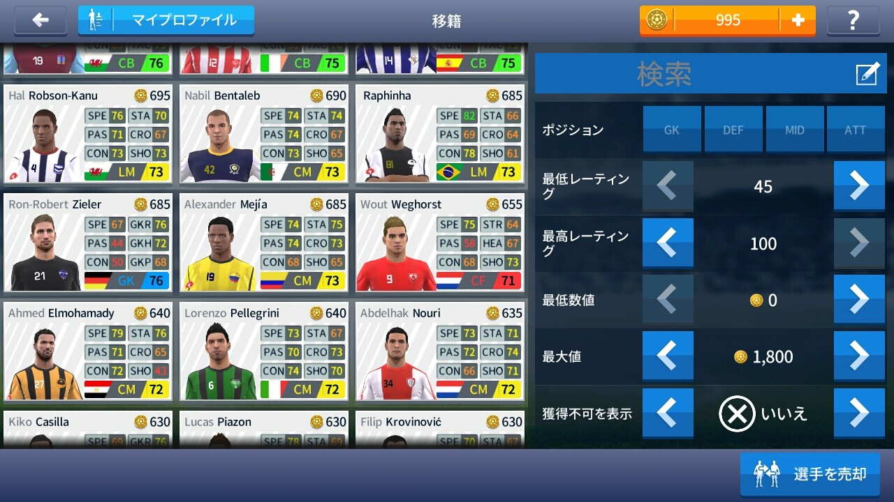 ポジションや能力値で絞込みもできるので、自分のチームに足りない戦力を補うところが攻略のポイントです。