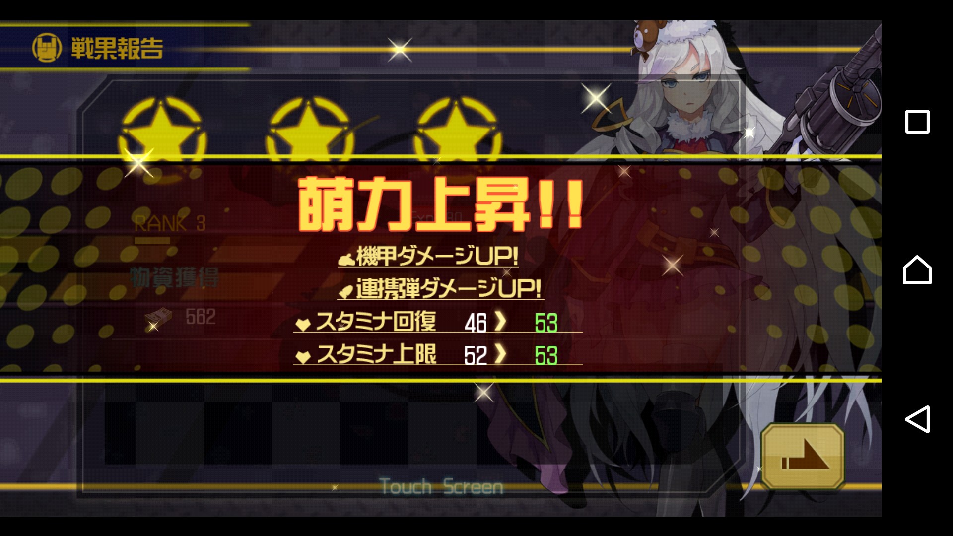 戦闘に勝利して一定の経験値を積むと、主人公の「萌力」がアップします。つまりレベルです。攻撃力などがアップする他、行動力=スタミナの上限がアップし、更に全回復します。マップの初クリア報酬などで、新たなキャラクターを獲得することもできます。
