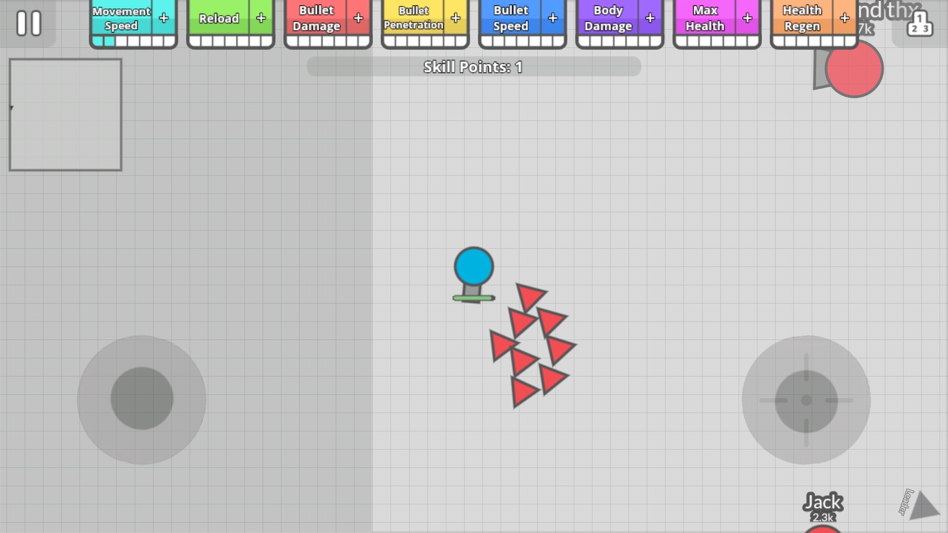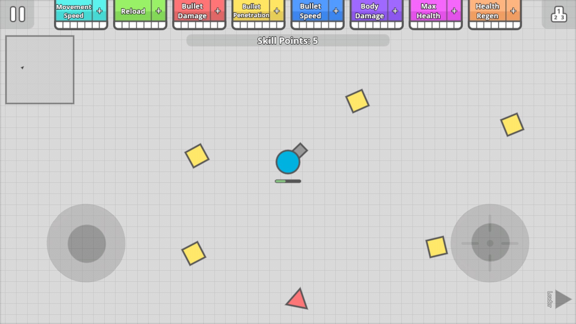 オブジェクトや戦車を破壊し続けると、スキルポイントが溜まっていきます。スキルポイントは画面上に出ています。更にその上に、8色のマス目が表示されていると思います。スキルポイントは、これらのマス目に振って、戦車を強化&カスタマイズすることができるのです。