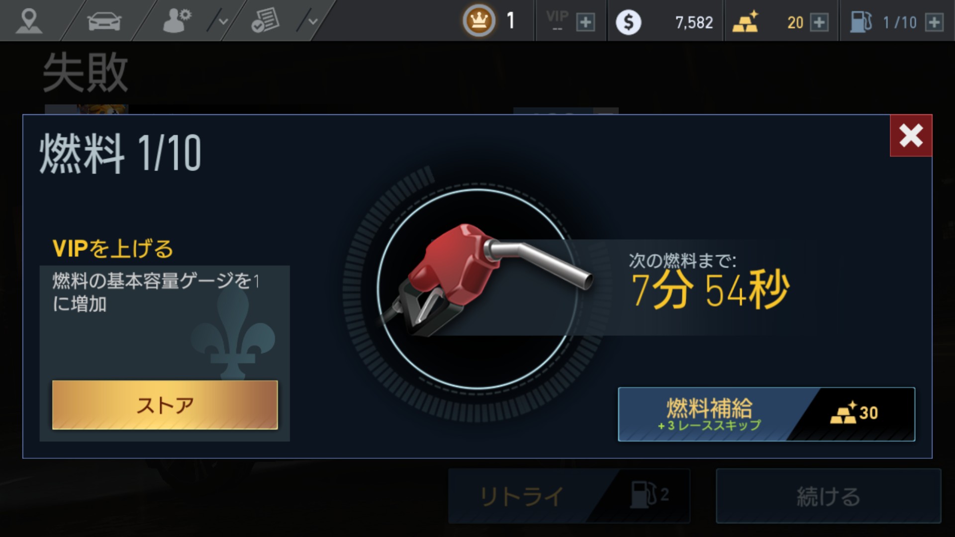 とはいえ、車を走らせるためには当然のように燃料が必要です。燃料はレベルアップのたびに全回復できますが、レースで連敗した状態で燃料を使い切ってしまうと、回復までに時間がかかります。これが、他のゲームで言うところのスタミナや体力に相当します。序盤では燃料を使い切る前にレベルが上がっていくので、燃料の残量を気にしないで走ることができますが、負け続けるといたずらに燃料を消費するだけになってしまいます。ストアで回復アイテムを買うか、回復まで気長に待ちましょう。