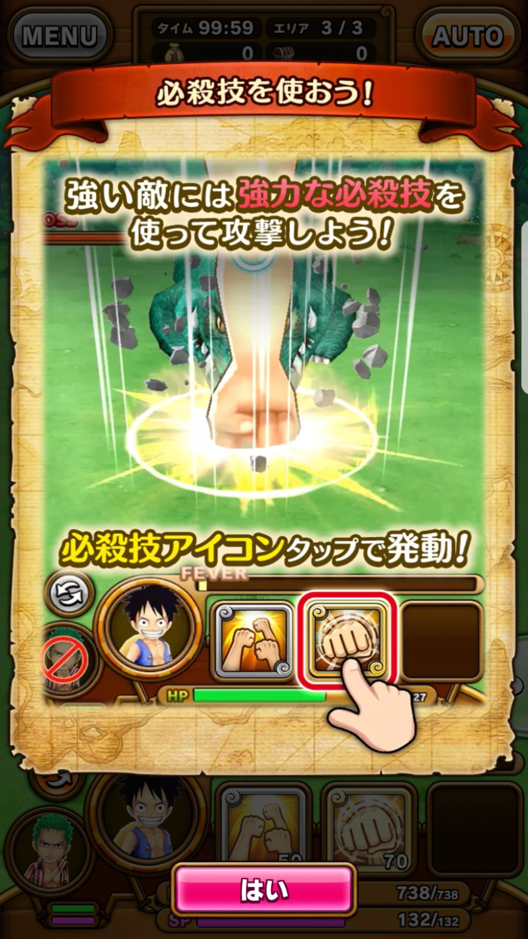 フィーバー中は「技」や「必殺技」の消費SPが半分になるので一気に叩き込みます