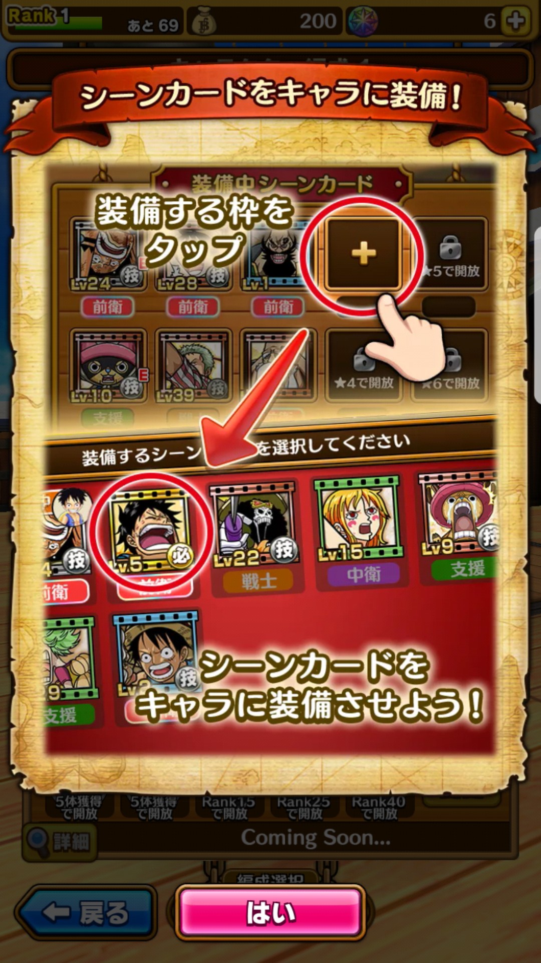 装備方法はTOP画面の下にある編成というボタンをタップ→シーン装備→装備させたいキャラを選んで